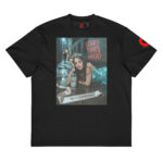 The Scary Times Ahead II T-Shirt captures a chilling scene — a young woman sprawled on concrete, bottle in hand, while a shadowy figure looms in the darkness. No safety. Just pure horror energy.